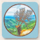 Landschafts- und Elchmalerei innerhalb eines Kreises-Rahmen. Dieser mächtige Elch hat Bäume als Geweihe angebaut. Er steht hoch und wacht über seinen Wald aus Hügeln und Gewässer. Artwork Copyright© 2017 Kimberly J Tilley.