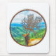 Landschafts- und Elchmalerei innerhalb eines Kreises-Rahmen. Dieser mächtige Elch hat Bäume als Geweihe angebaut. Er steht hoch und wacht über seinen Wald aus Hügeln und Gewässer. Artwork Copyright© 2017 Kimberly J Tilley.