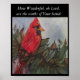 Der lebendige rote "King Kardinal" sitzt stolz auf einem Zweig mit Blätter. Dieses Plakat wird mit einer Erinnerung der Geschenke, die diese Welt zu bieten hat, "Wie wunderbar, Oh Herr, sind die Werke deiner Hände" Bereit zum Framing.