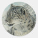 Eine schneebedeckende Leopardin, die an einem entfernten Punkt in den umliegenden Bergen aufblickt, ist ihr schönes Fell eine perfekte Tarnung. Von "Summit King", Morgane's Original-Acrylgemälde. Ideal für alle Tierliebhaber.