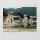 Eine zauberhafte, gewölbte japanische Brücke über einen Fluss, die auf großen Säulen aus gelbem Stein ruht.