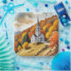 Kleine weiße Kirche auf einem Hügel mit Bergen, Herbstblättern und Baumherbsthintergrund.