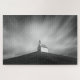 Foto-Puzzle einer kleinen Kirche oder Kapelle auf einem Hügel unter bewegungsundurchlässigen Wolken im Himmel in Schwarz-Weiß, wodurch ein sehr starkes konzeptuelles Bild des behaltend Glaubens in raue Zeiten entsteht.