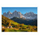 Foto des kleinen Dorfes Sankt Magdalena mit der prominenten, von Bäumen umgebenen Kirche in Herbstfarben vor den Gipfeln der Dolomiten im letzten Tageslicht im Tal der Villnöss (Funes) in Südtirol, Italien.