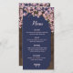 Vollständig anpassbare Menu Card oder Programmkarte mit einem Hauch von blassrosa Kirschblüten auf marinebasischem Nachthintergrund. Der gesamte Text ist vollständig editierbar. Auf der Rückseite befindet sich ein Kranz mit Kirschblüten, in dem Sie die Initialen des Paares, ein Datum oder eine andere Textauswahl hinzufügen können.