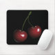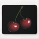Ein Paar rote, saftige, köstliche Kirschen auf einem Mattschwarzhintergrund.