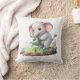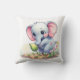 Das ist ein Bild eines Kissens mit einem niedlichen Cartoon-Elefanten darauf. Der Elefant ist hellgrau mit großen rosa Ohren und rosigen Wangen. Es hält eine kleine grüne Gießkanne und gießt winzige grüne Sprossen in einem Gartenbett. Kleine Blume und Gras rund um den Elefanten