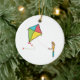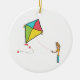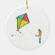 Drachen fliegen an einem windigen Tag. Drachen mit Band Schwanz fliegt hoch in der Luft und unten auf dem Boden ist ein Drachen Flyer. Die Freude am Drachen in einer einfachen Illustration.
