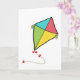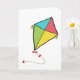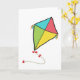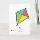 Kite-Design zeigt einen handgezeichneten Drachen, der in der Luft fliegt, mit geometrischen Farben, Kite-Schwanz und Bändern. Für Drachenflieger.