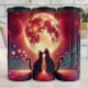 This enchanting digital illustration features the romantic silhouettes of two kittens sitting side-by-side under the glow of a massive, detailed full moon. The artwork is bathed in warm crimson and golden tones, creating a magical evening atmosphere. Vibrant pink and red hearts float through the air like stardust, while the foreground and surrounding forest are rendered in rich, stylized textures. This seamless-style graphic is designed as a full-wrap for insulated tumblers, offering a breathtaking 360-degree visual narrative of feline affection. The high-contrast lighting and dreamlike setting make it an ideal gift for cat lovers or a stunning accessory for Valentine Day celebrations.
