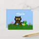 Cute Kitty et Frog, assis dans un champ d'herbe et de fleurs, avec des papillons, et le ciel bleu. Bonjour carte postale