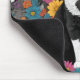 Eine Schwarz-Weiß-Katze ist umgeben von einer Fülle von Blume in lebhaften Farbtönen in Orange, Blau, Rosa und Gelb. Der Hintergrund ist voll von einem dichten, komplizierten Blumenmuster, das die fesselnden gelben Augen der Katze hervorhebt.