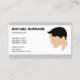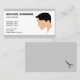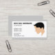 Diese personalisierbare Friseur / Friseur Stylist / Friseur Theme Visitenkarte Features Desteis Abbildung eines Mannes Profil. Der Mann hat ein klassisches kurzes Männerhaar und ein rasiertes Gesicht. Neben dem Bild befinden sich personalisierbare Textbereiche für Namen, Beruf und Kontaktinformationen. Die Hintergrundfarbe ist weiß mit grauen Rändern oben und unten. Auf der Rückseite ist eine kleine schwarze Silhouette von Scheren auf grauem Hintergrund.