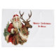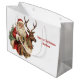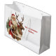 Geschenktüte mit einer lustigen Weihnachtsillustrierung. Der Weihnachtsmann in seinem traditionellen roten Anzug reitet auf einem großen, mit Heiligen dekorierten Rentier. Ein Weihnachtsbaum hinten.