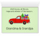 Individuell anpassbare Weihnachtskarte. Handgezogener Retrowagen mit Geschenken. Fügen Sie den Namen Ihres Familienmitglieds oder Freundes hinzu, um eine einzigartige Weihnachtskarte zu erstellen