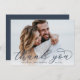 Elegante Hochzeitsdankkarten verfügen über ein horizontal oder landschaftlich orientiertes Foto mit "Danke" überlagert in schicken marineblauen Kalligraphie-Skript, Personalisieren mit Ihren Namen und Hochzeitsdatum am unteren Rand in klassischer Blockschrift. Fügen Sie der Rückseite eine persönliche Nachricht und Signatur hinzu.