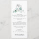 Beginnen Sie Ihren Hochzeitsfeier mit diesem klassischen, grünen, eukalyptus-kalligraphischen Hochzeitsmenü. Das Design umfasst wassergrüne Eukalyptus-Blätter.