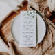 Dieses klassische, minimalistische eukalyptus formale Hochzeitsmenü ist perfekt, um eine einfache Hochzeit zu ergänzen. Das Design besticht durch einen wunderschönen kalligraphischen Schriftart und einen grünen Aquarell-Eukalyptus.