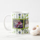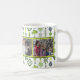 St. Patrick's Day Tasse. Personalisieren Sie dieses charmante Design für ein glückliches Elternteil oder Großeltern, um ihren Kindern zu zeigen. Ideal für eine frische, moderne Ästhetik. Niedliche Kleeblätter, vierblättriges Kleeblatt, Blume und Blätter, die in Streifen angeordnet sind, bilden dieses reizvolle Muster. Schöne Frühlingszeit Grüntöne und Gelb mit gedämpfter Blues machen dies zu einem lebendigen und dennoch anspruchsvollen und auffälligen Design. Weißer Hintergrund. Passen Sie diese Tasche mit sechs (3) Fotos an. Personalisieren Sie den Text vorne und hinten. Weißer Hintergrund.