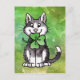 Eine schwarz-weiße Katze mit einem dreiteiligen Kleeblatt im Mund, zum St. Patrick's Day oder einfach nur zum Spaß!