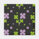 Originelles, nahtloses Blumenmuster, lila und grüne Kleeblätter auf schwarzem Hintergrund.