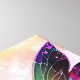 Eine junge Fee mit lebhaften, bunten Flügeln kniet anmutig, umgeben von flatternden Schmetterlingen. Sie ist in einem farbenfrohen Outfit mit Blume geschmückt, die ihr die Haare hervorheben und eine zarte Blüte in der Hand halten