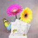 Ein kleiner Schmetterling ist unterwegs! Rosa, lila und gelbe Schmetterlinge und sonnengelbe Rosen mit rosa geometrischem Rahmen