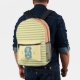 Ein niedlicher mehrfarbiger Schulrucksack für Kinder mit einem gelben Entenlein, das ein Buch hält, vorn einige grüne und gelbe Streifen und an der Seite einige orangefarbene Ente-Pfoten. Personalisieren Sie es mit dem Vor- und Nachnamen des Kindes . © ArianeC Illustrations-Alle Rechte vorbehalten