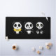 Zwei kleine Pandas sitzen im Dunkeln mit einem kleinen Skelett. Ein Panda trägt ein gelbes T-Shirt mit dem Wort "meh" darauf.