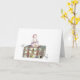 Eine kleine Bisque-Puppe mit rotem Haar und einer silbernen Halskette sitzt, gewartet, auf einem Vintage-Reisekoffer. Die als "Bon Voyage", "Safe Travels" oder "Vermisste You" Karte konzipierte Innenseite ist leer für Ihre eigene Nachricht.