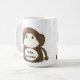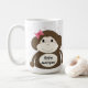 Genießen Sie Ihren Drink mit dieser Tasse, die von einem humorvollen kleinen Affen mit einem breiten Lächeln, dunkelbraunem Fell und einem rosa Haarbogen geschmückt ist. Es ist Set vor einem weißen Hintergrund, gesprenkelt mit rosa Punkten und gerahmt durch einen rosa Rand. Der Begriff "kleiner Affe" ist auf Ihre Vorlieben zugeschnitten.