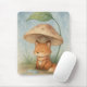 Eine skurrile Aquarellillustrierung eines kleinen Fuchses, der bei sanftem Regen unter einem riesigen Pilz Schutz nimmt. Mit sanften, erdigen Tönen und einer verträumten Atmosphäre erweckt dieses Stück den stillen Zauber eines Regentages im Wald.