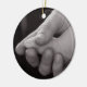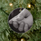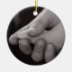 Ornament mit einem Schwarz-Weiß-Foto eines winzigen Fußes in einer großen Hand.