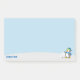 Kleiner Pinguin mit Schneeballschuhen, der nach de Post-it Klebezettel