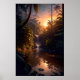 Entdecken Sie einen bezaubernden Dschungel, wo ein kleiner Wasserfall sanft inmitten üppiger Flora liegt, die alle in der warmen Umarmung der untergehenden Sonne liegen. Die Schönheit der Natur blühe in dieser bezaubernden Szene und lädt Sie ein, die Geheimnisse des Dschungels zu erkunden. Tauchen Sie ein in den faszinierenden Reiz dieser malerischen digitalen Kunst, in der die Wunder der Wildnis zum Leben erweckt werden.