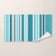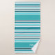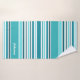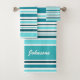Hübsche, helle und türkisfarbene Linien auf einem aquamarin gestreiften Badetuch-Set, das auf Ihren Nachnamen zugeschnitten ist. Die perfekte Badedekoration eines Strandhauses erinnert an die hübschen Farbtöne des Meeres oder des Meeres.