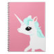 Ein gewundener Notizblock, der eine entzückende vektorillustration eines weißen Einhorns mit einer flüssigen blauen Mähne auf einem rosa Hintergrund kennzeichnet.