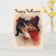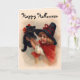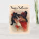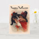 Herrliche Vintage Kunst kennzeichnet ein kleines Hexemädchen in spitzem schwarzem Hut und rotes Kap mit ihrem niedlichen schwarzen Kätzchen. Glücklicher Halloween-Text kann von Ihnen besonders angefertigt werden.