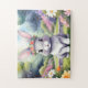 Aquarellmalerei eines bezaubernden kleinen Kaninchens mit einer Blume-Krone vor einem blumigen Hintergrund.