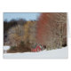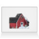 Ein kleines Haus inmitten einer Winterlandschaft mit bunten Bäumen.
