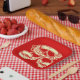 Eine rote und gelbe Victor-Abbildung eines Klettergurtes. Ein Design für alle, die Lieben zu klettern. Dieses Design kann mit Ihrem eigenen Text angepasst werden.