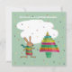 kerstkaart met afbeelding van kleurige kerstboom en konijn met kersttrui in dezelfde kleuren. tekst: fijne kerst en een gelukkig nieuwjaar.