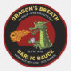 Grüner Drachen-Cartoon mit einer Knoblauchzwiebel. Flamme mit dem Wort Knoblauch kommt aus seinem Mund. Benutzerdefinierte Hintergrundfarbe. Fünf Textfelder zum Anpassen.