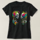 Zwei stilisierte Schädelprofile werden auf einem schlichten, weißen Hintergrund präsentiert. Jeder Schädel ist von lebhaften, farbenfrohen Blume und Blättern umgeben, die einen dekorativen und fast blumigen Kranz um jeden Kopf bilden. Die Blume sind fuchsienfarben, rosa, orange, gelb, aquamarin und in anderen hellen Farben gehalten. Die Blätter und Weinberge sind in grünen Farbtönen gestrichen, die ein natürliches Wachstum nachahmen.