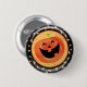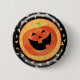 Glücklicher Halloween-Knopf mit Kürbislaterne- und Süßigkeitsmais gegen einen schwarzen und orange Hintergrund.