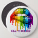 Regenbogenlippen auf einem kreisförmigen Knopf (Abzeichen) mit weißem Hintergrund. Lippen werden mit den Farben der LGBT Community Stolz Fahne im Graffiti-Stil überlagert. Ganz unten steht ein lila Slogan, der "Kiss My Rainbow" sagt, jeden Tag auf der Jacke oder bei jedem LGBT Event mit Stolz tragen. Zeige deinen Vintagen Stolz!