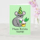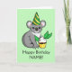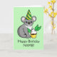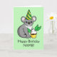Célébrez votre anniversaire de véritable mode australienne avec ce koala adorable dans un casquette de partie de vert et d'or. Il prend même un petit petit gâteau d'anniversaire fait avec le feuille d'eucalyptus !