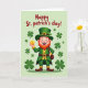 Diese Karte zeigt einen fröhlichen Leprechaun, der vor einem hellgrünen Hintergrund nach vorne schaut, sein breites Lächeln und seine rosigen Wangen geben ihm ein freundliches und einladendes Aussehen 💚. Er trägt ein smaragdgrünes Outfit mit einem hohen Hut, der mit einer kleinen Gruppe Shamrocks gekrönt ist, und sein feuriger roter Bart umrahmt sein offenes Lächeln, als ob er jemanden begrüßt, den er gerne sieht. Verstreute Shamrocks und Vierblattklee schweben um ihn herum und schaffen eine leichte und festliche Atmosphäre, die wie ein Glückstag mit Freunden wirkt ☘️. In seiner linken Hand hält er eine glänzende Goldmünze mit einem Dollarzeichen, als ob er ein kleines Geheimnis darüber verrät, wo der Schatz sein könnte. Der Mantel, die Weste und die Hose sind in verschiedenen Grüntönen detailliert dargestellt, während seine braunen Stiefel mit gelben Schnürsenkeln und einer goldenen Schnalle hervorstechen, die das Licht einfängt. Oben erscheint die Nachricht "Happy St. Patrick's Day!"