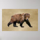 Ein digitales Gemälde eines Kodiak Bären auf einem neutralen Pergament, oder altes Papier, Hintergrund. Der Kodiak-Bär (Ursus arctos middendorffi), eine Unterart des Braunen oder Grizzly, ist der größte Bär der Welt. Ein vollgewachsenes Männchen kann über 1,50 m hoch sein, wenn es aufrecht auf seinen Hinterbeinen steht und über 1500 Pfund wiegt - ein wahrer Anblick. Ein Bär im Bismarck, der Zoo von Nord-Dakota, hat schätzungsweise bis zu 2400 Pfund gewogen. Die Bären leben auf den Inseln des Kodiak-Archipels von Alaska. Heute gibt es ca. 3500 Kodiak-Bären und ihre Anzahl steigt aufgrund der im Allgemeinen ausgezeichneten Lebensbedingungen, inklusive ausreichend Faust zum Essen. Sie werden in Alutiiq "takuka-aq" genannt, der Sprache der Einwohner dieser Gegend. Man glaubt, dass die Bären dort seit gegen Ende der letzten Eiszeit vor über 12.000 Jahren abgeschieden waren. Obwohl sie die größten terrestrischen Fleischfresser sind, umfasst ihre Ernährung große Mengen von Gras, anderen Pflanze und Beeren. Heute gibt es etwa 3500 Kodiakbären, deren Anzahl aufgrund des allgemein ausgezeichneten Zustands ihres Lebensraums, einschließlich ausreichender Fische zum Essen, zunimmt. Aufgrund des Überflusses an Nahrungsmitteln haben Kodiak-Bären kleinere Zuhause-Reichweiten als alle anderen Braunbären und brauchen keine Gebiete zu verteidigen. Die Alutiiq jagen Bären für Nahrung, Kleidung und Werkzeuge. Pfeile, Speere und viel Mut waren notwendig für die Jagd. Bärenköpfe wurden in der Regel auf dem Feld als Zeichen des Respekts vor dem Geist der Bären links.