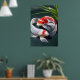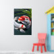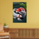Poster von zwei Koi-Fischen mit komplizierten Mustern, die anmutig nebeneinander vor einem dunkelgrünen Hintergrund schwimmen, hervorgehoben durch die Anwesenheit von ein paar lebhaften grünen Pflanze-Blätter. Die detaillierten Schuppen und zarten Flossen des Koi schaffen eine ruhige und harmonische Wasserszene.